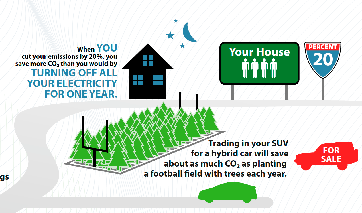 The Watershed Company, a digital advocacy agency, asked us to create an information graphic to visualize how small actions can have big impacts on climate change. Their client, the Union of Concerned Scientists, were introducing a book on the subject, and Watershed was creating an online calculator that people could use to show how things like using a programmable thermostat or eating less meat could help to significantly reduce CO2 emissions. Originally the UCS had conceived of a house graphic, showing all the actions within it that could make a difference. From there the graphic would expand out to show families, friends, cities, and nations doing the same actions to generate large savings in emissions. After one round of this concept, however, it became clear that there was too much to show in one small area like a house. So we visualized those actions within one screen-view of the house level, instead. We maintained a color palette brought over from Watershed's site, and used a consistent style of flat iconic illustrations tied into a road that gets larger with the increase in cumulative positive action. Both Watershed and the UCS loved the graphic, and it has been integrated into their site at coolersmarter.org.